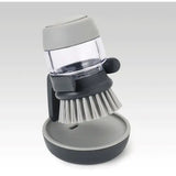 This scrubbing brush features a soft rubber top that dispenses dishwashing liquid with a simple press, delivering soap directly to the bristles for efficient cleaning.
